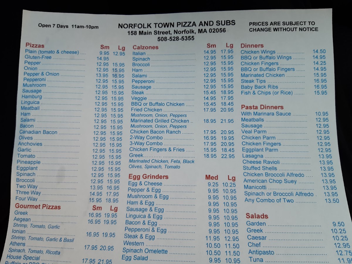 Norfolk Town Pizza Menu